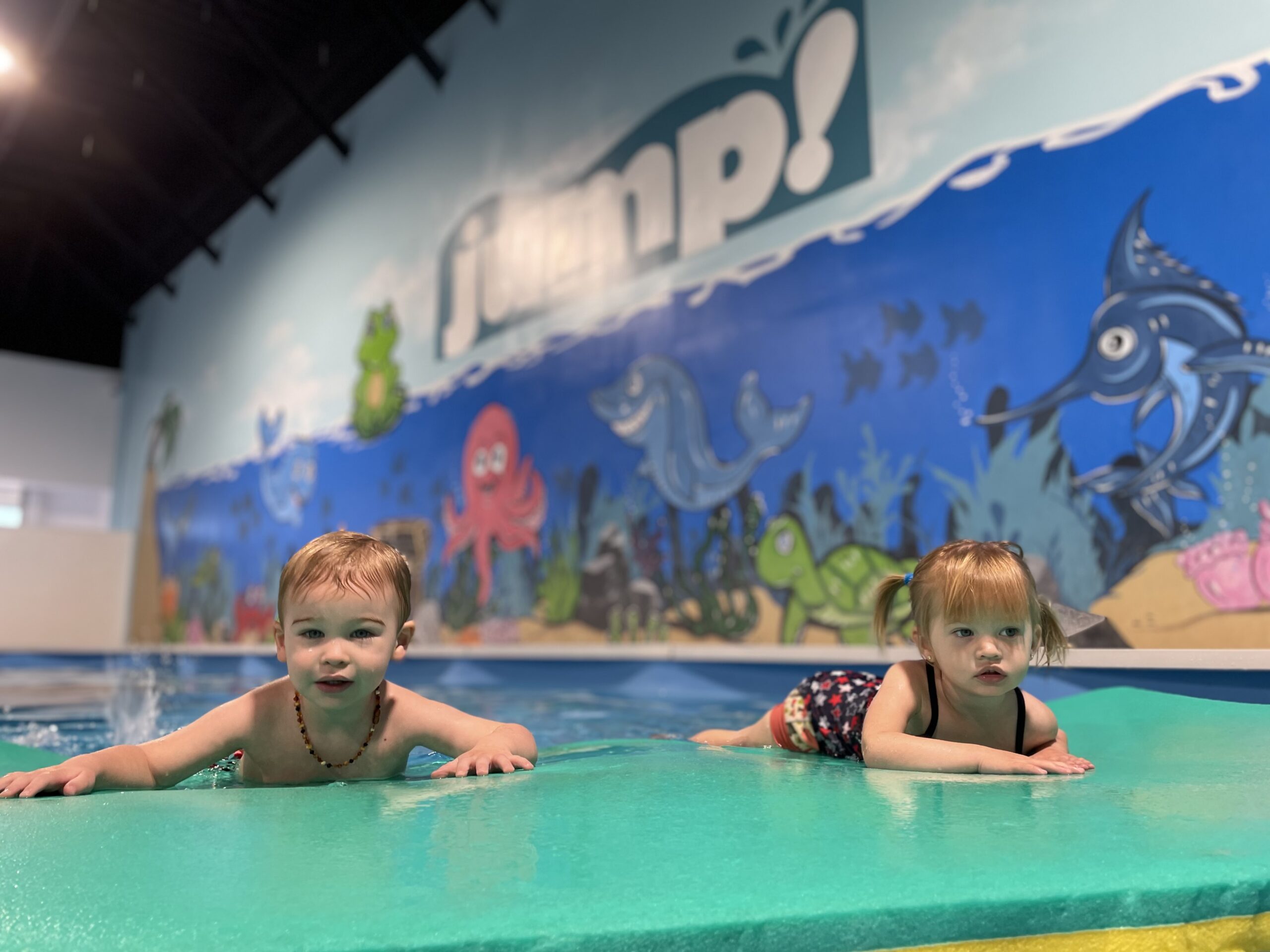 Each class includes a variety of songs, games, and interactive activities that make learning to swim enjoyable while reinforcing water confidence. These lessons also provide a wonderful opportunity for bonding, allowing children to feel safe and supported as they continue building their comfort and familiarity in the water. During the lesson, children begin developing stronger swimming movements through guided practice using noodles and kickboards. These tools help toddlers learn how to kick and paddle effectively while improving coordination, balance, and body awareness in the water. Instructors focus on building unassisted mobility and buoyancy skills so children gradually learn to move more independently while maintaining proper floating and kicking techniques.